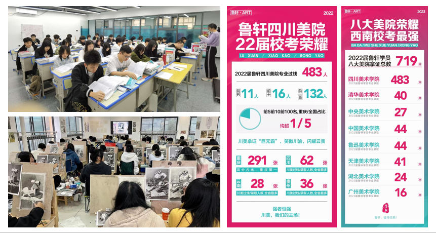 4.详细介绍:重庆鲁轩美术培训学校是全国知名的美术高考培训机构,为广大美术艺考生、艺术特色高中等提供了有竞争力的系统化教学与服务,对美术基础联考教学,清华美院等高端教学领域进行持续的研发投入,目前是西南地区乃至全国最具影响力的美术教育品牌之一。2022届美术联考总人数11825余人,鲁轩重庆教学部参考人数1089人,重庆全市五分之一高分段出自鲁轩。