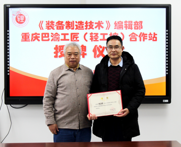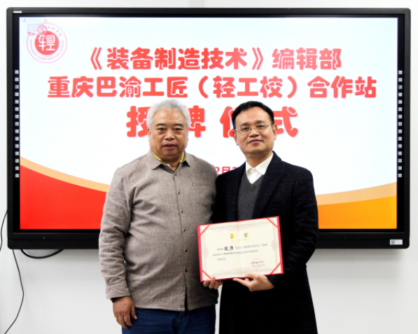 梁教授代表编辑部向学校授予“重庆市巴渝工匠合作站”牌匾 。