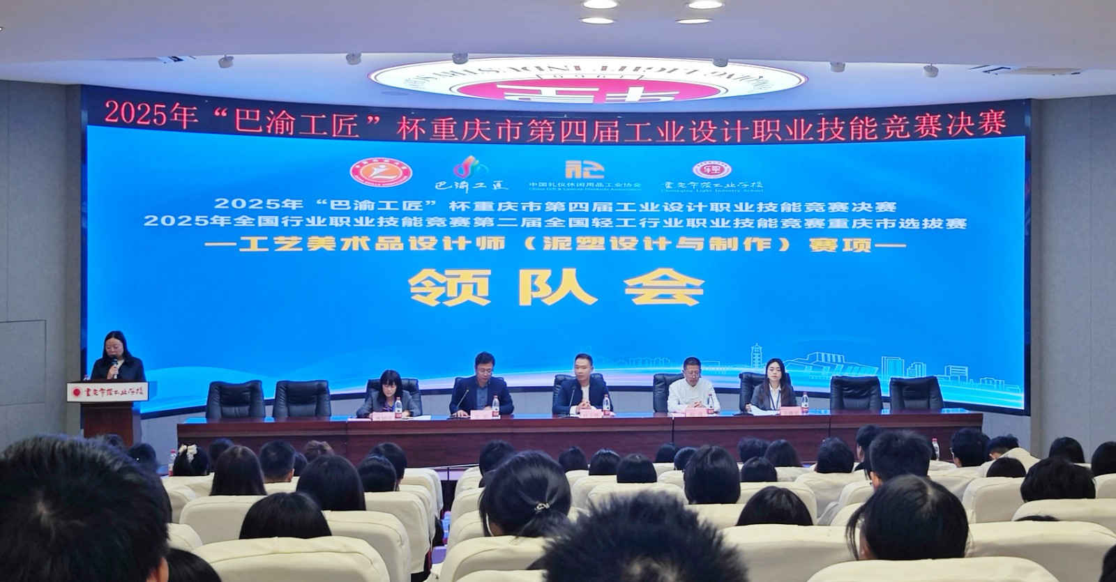 重庆市工艺美术大师刘强,重庆市轻工业学校党委副书记吕正伟、大赛办主任兼教务科科长吴珩、文化艺术系主任吴晓明、文化艺术系副主任林颖佳出席领队会,会议由学校大赛办副主任兼教务科副科长陈治玥主持。
