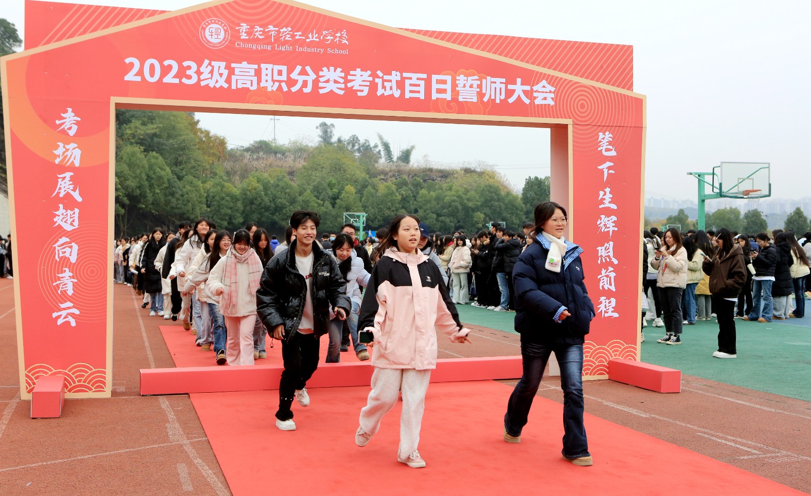 大会的最高潮出现在尾声部分。在激昂的乐曲和全场师生热烈的掌声与瞩目中,全体2023级学子精神抖擞,意气风发,以整齐的队列依次快步穿过象征着成功与吉祥的“状元门”。他们坚毅的目光、自信的笑容和铿锵的步伐,充分展现了轻校学子敢于拼搏、勇攀高峰的昂扬斗志,现场氛围隆重而振奋。