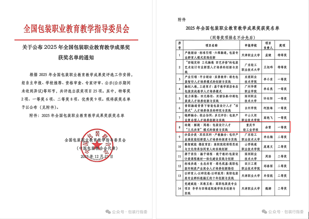 近日,全国包装职业教育教学指导委员会公布《关于2025年全国包装职业教育教学成果奖获奖名单的通知》,我校教师余雷领衔的重庆市CMF设计工作室团队组织申报的《命题•解题•阅卷:包装设计人才“三元共育”模式的探索与实践》斩获2025年全国包装职业教育教学成果一等奖,为全国唯一获奖中职学校!