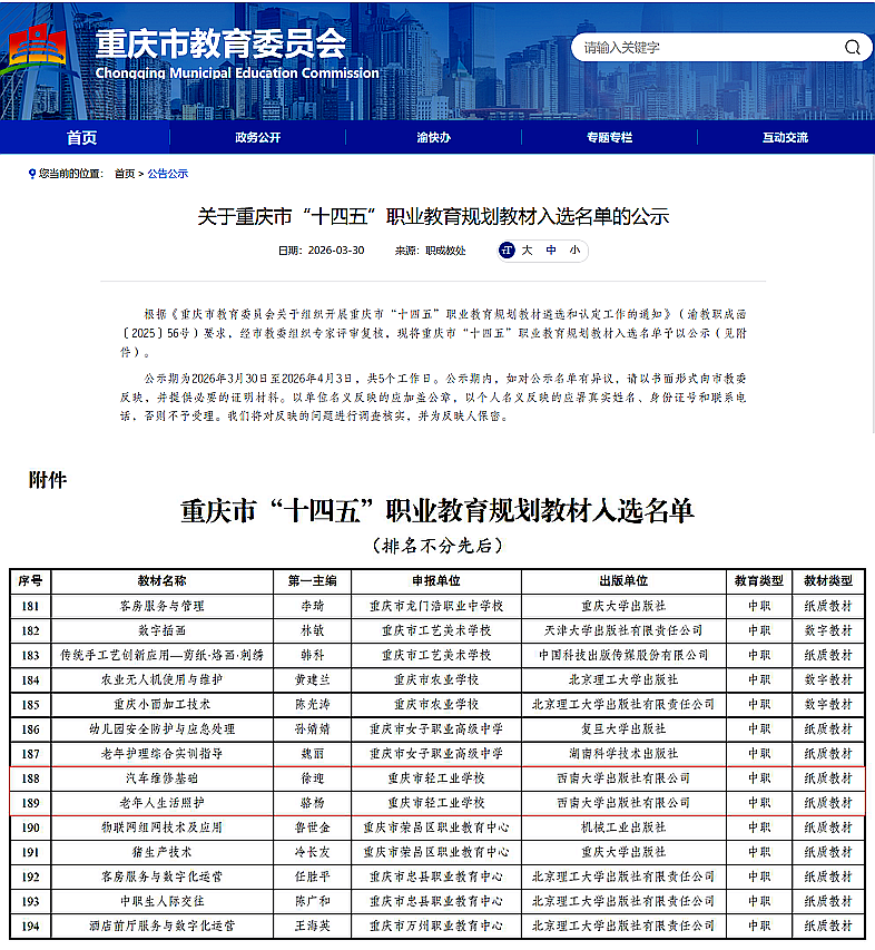 近日,重庆市教育委员会公示了重庆市“十四五”职业教育规划教材入选名单,学校《汽车维修基础》《老年人生活照护》两本教材入选。