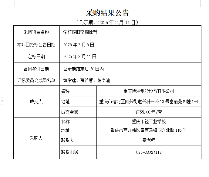 学校废旧空调处置结果公告