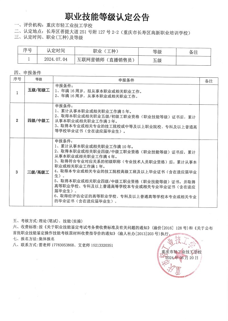 职业技能等级认定公告(长寿考点)