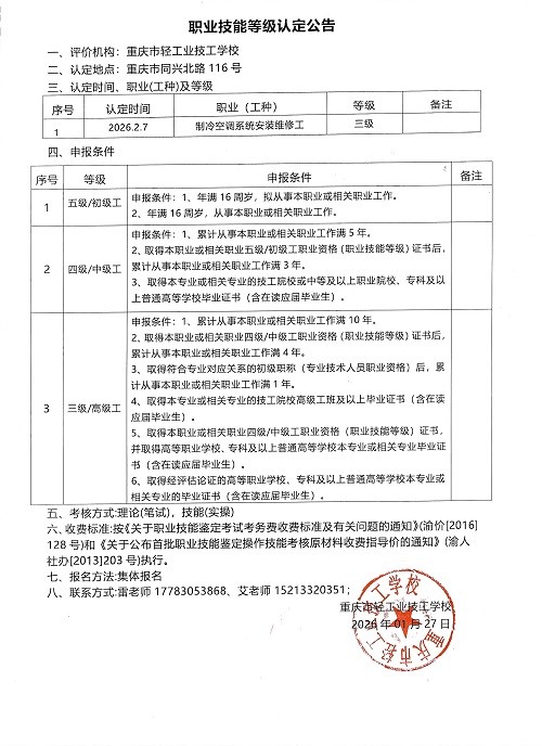 职业技能等级认定公告(2026.1.31-2.3)璧山考点