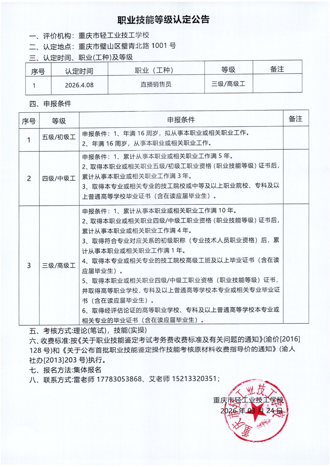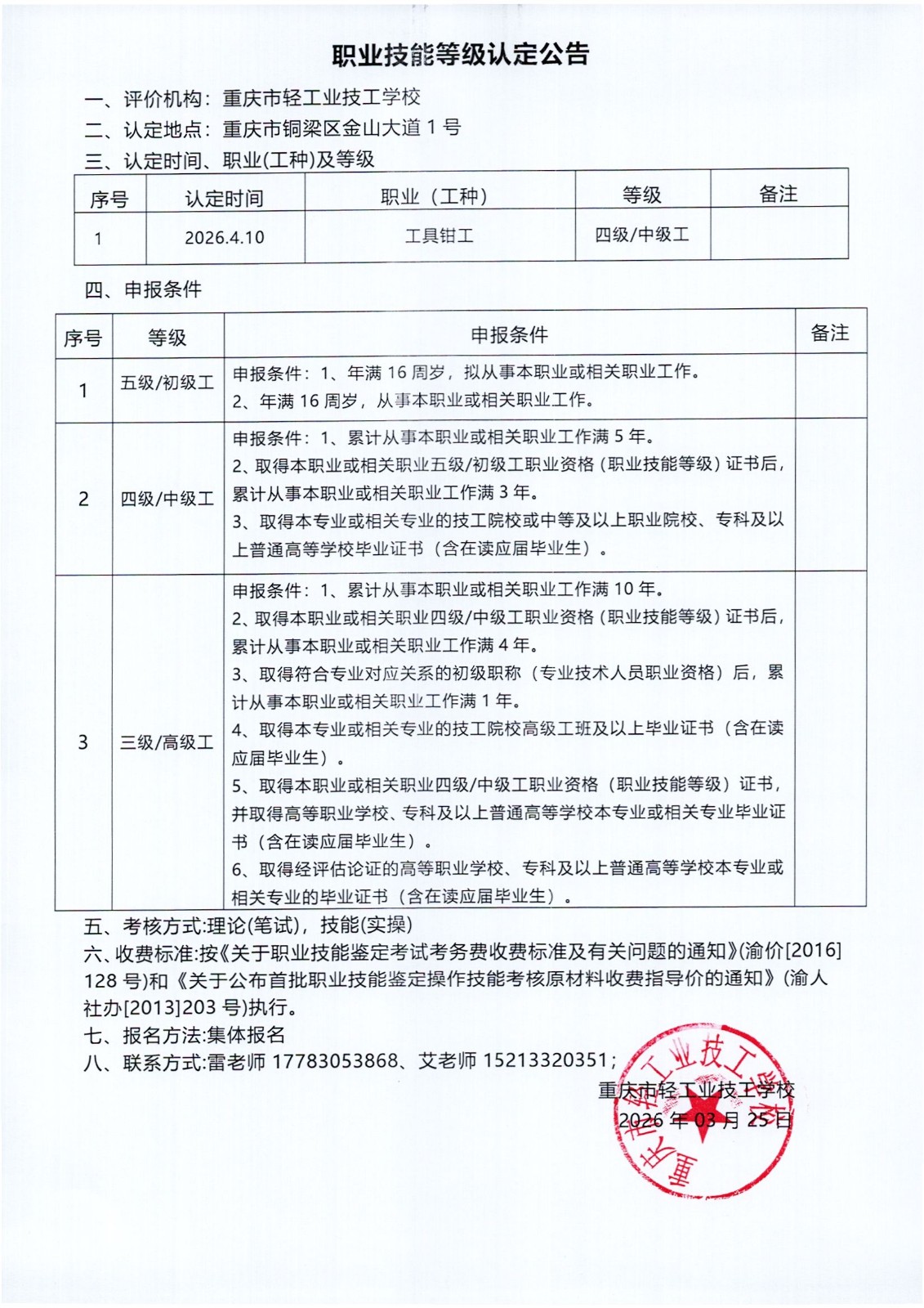 职业技能等级认定公告(2026.4.08-2026.4.10)