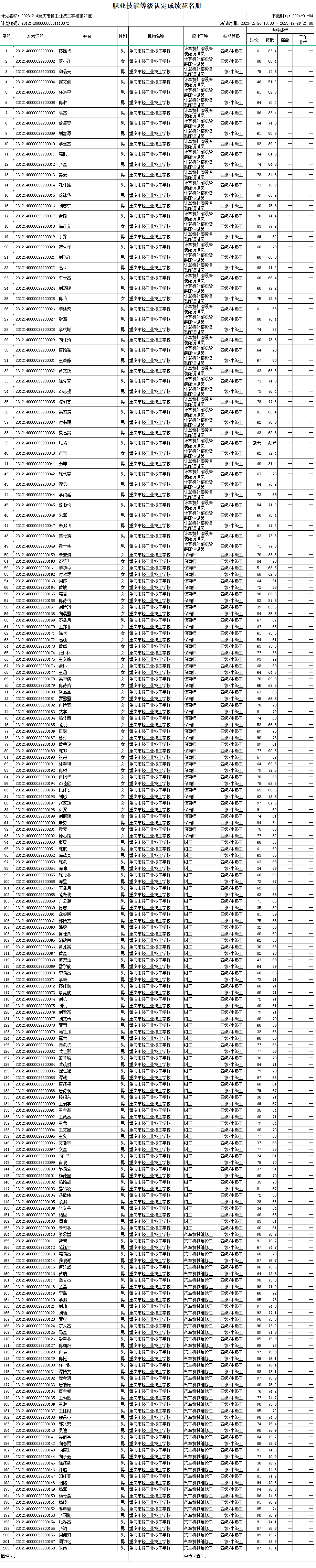 根据《重庆市职业技能等级认定考试考务工作规程( 试行 ) 的通知》(渝职鉴发[2021]23 号 ) 文件精神,重庆市轻工业技工学校现将 2023 年 12月 26日组织的共 1 批次202人职业技能等级认定成绩进行公示 (见附件)。 公示期为发布之日起计算 5 天,如对个人成绩有疑问,请在公示期内提出成绩复核申请,公示期结束,不再接受复核申请。