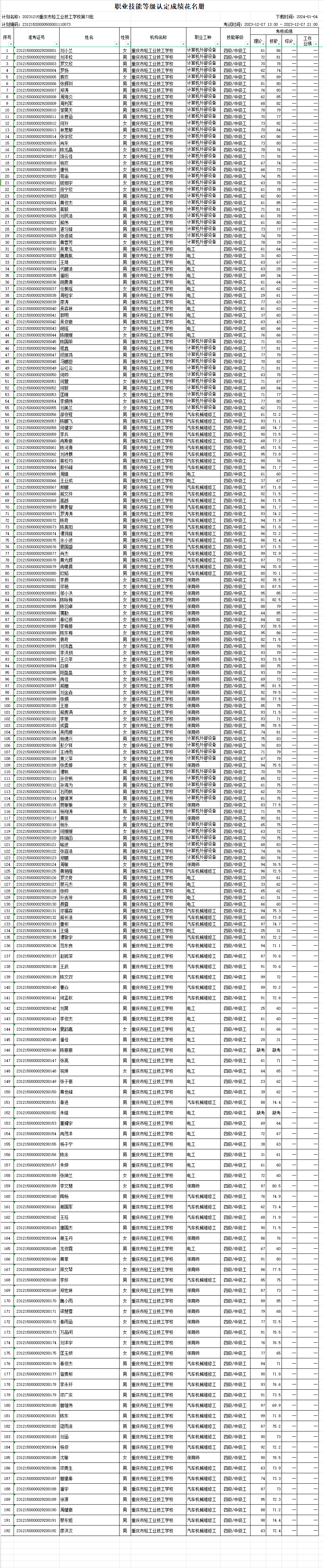 根据《重庆市职业技能等级认定考试考务工作规程( 试行 ) 的通知》(渝职鉴发[2021]23 号 ) 文件精神,重庆市轻工业技工学校现将 2023 年 12月 27日组织的共 1 批次 192人职业技能等级认定成绩进行公示 (见附件)。 公示期为发布之日起计算 5 天,如对个人成绩有疑问,请在公示期内提出成绩复核申请,公示期结束,不再接受复核申请。