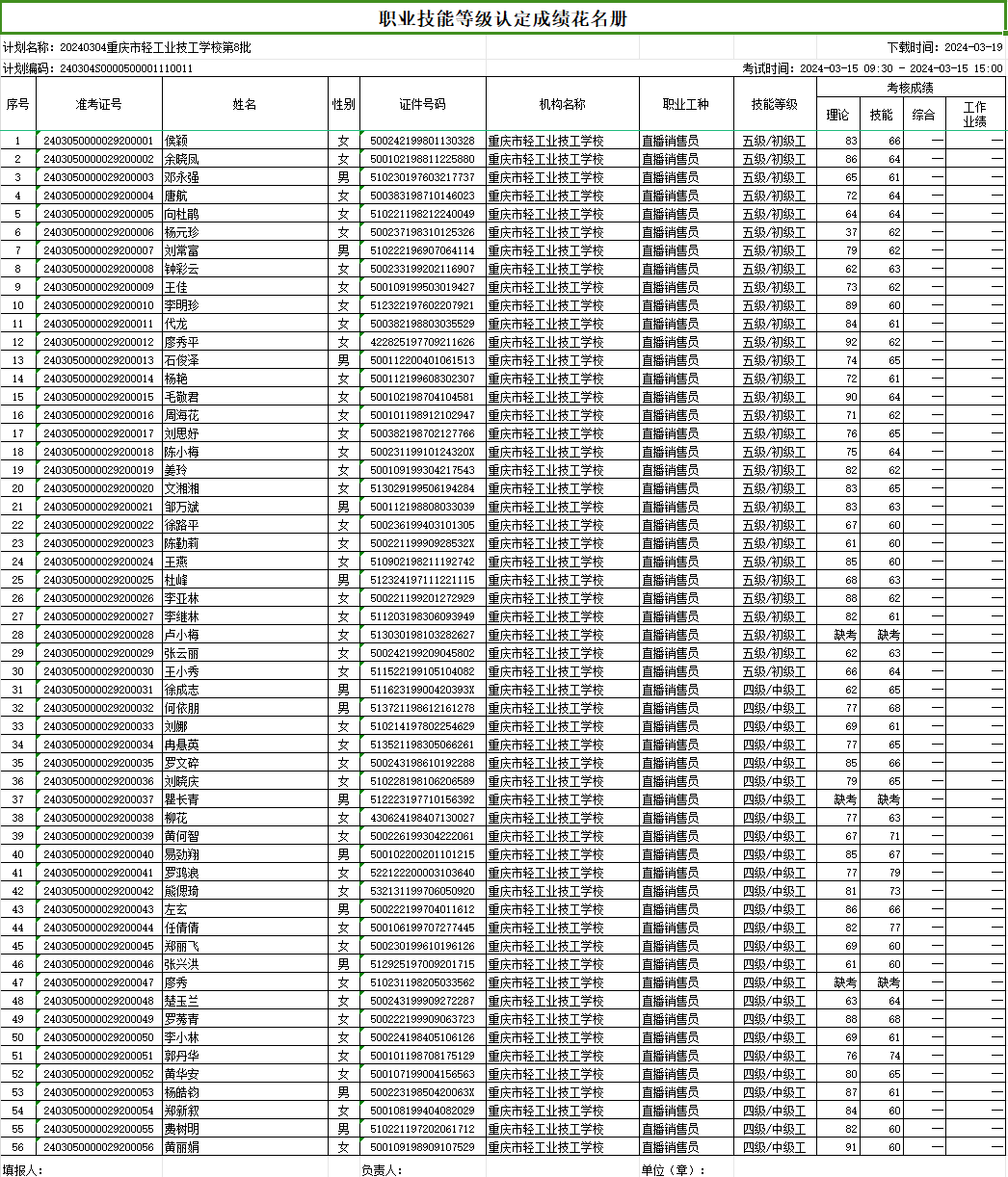 根据《重庆市职业技能等级认定考试考务工作规程( 试行 ) 的通知》(渝职鉴发[2021]23 号 ) 文件精神,重庆市轻工业技工学校现将 2024 年03月15日组织的共1个批次56人职业技能等级认定成绩进行公示 (见附件)。 公示期为发布之日起计算 5 天,如对个人成绩有疑问,请在公示期内提出成绩复核申请,公示期结束,不再接受复核申请。