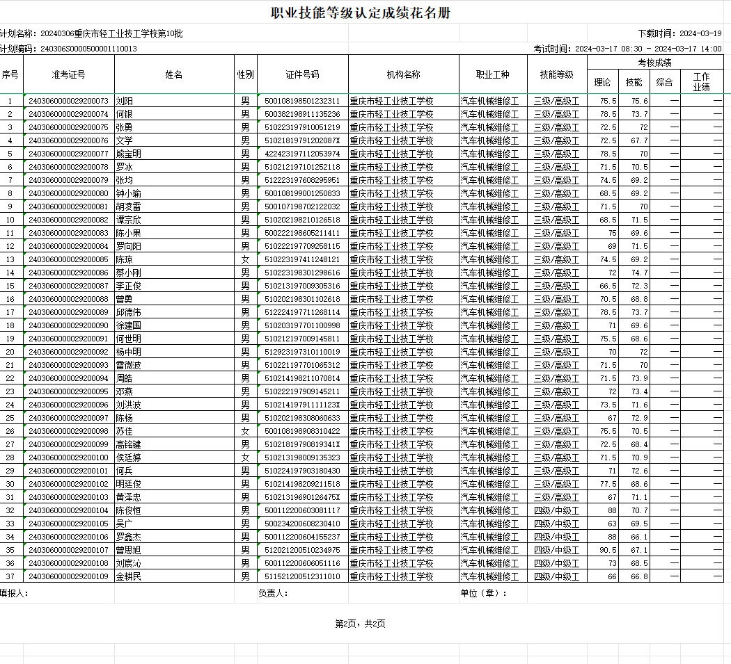 根据《重庆市职业技能等级认定考试考务工作规程( 试行 ) 的通知》(渝职鉴发[2021]23 号 ) 文件精神,重庆市轻工业技工学校现将 2024 年03月17日组织的共1个批次37人职业技能等级认定成绩进行公示 (见附件)。 公示期为发布之日起计算 5 天,如对个人成绩有疑问,请在公示期内提出成绩复核申请,公示期结束,不再接受复核申请。