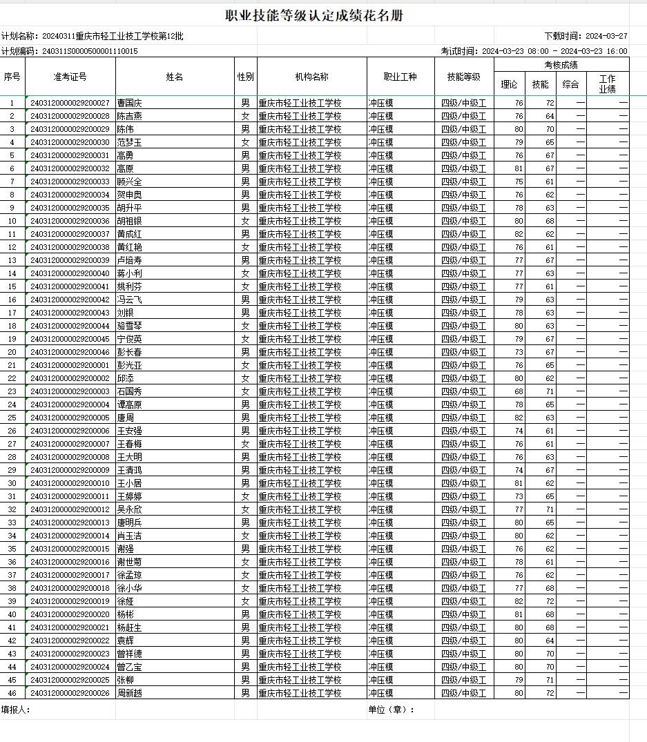 职业技能等级认定成绩花名册12批20240323
