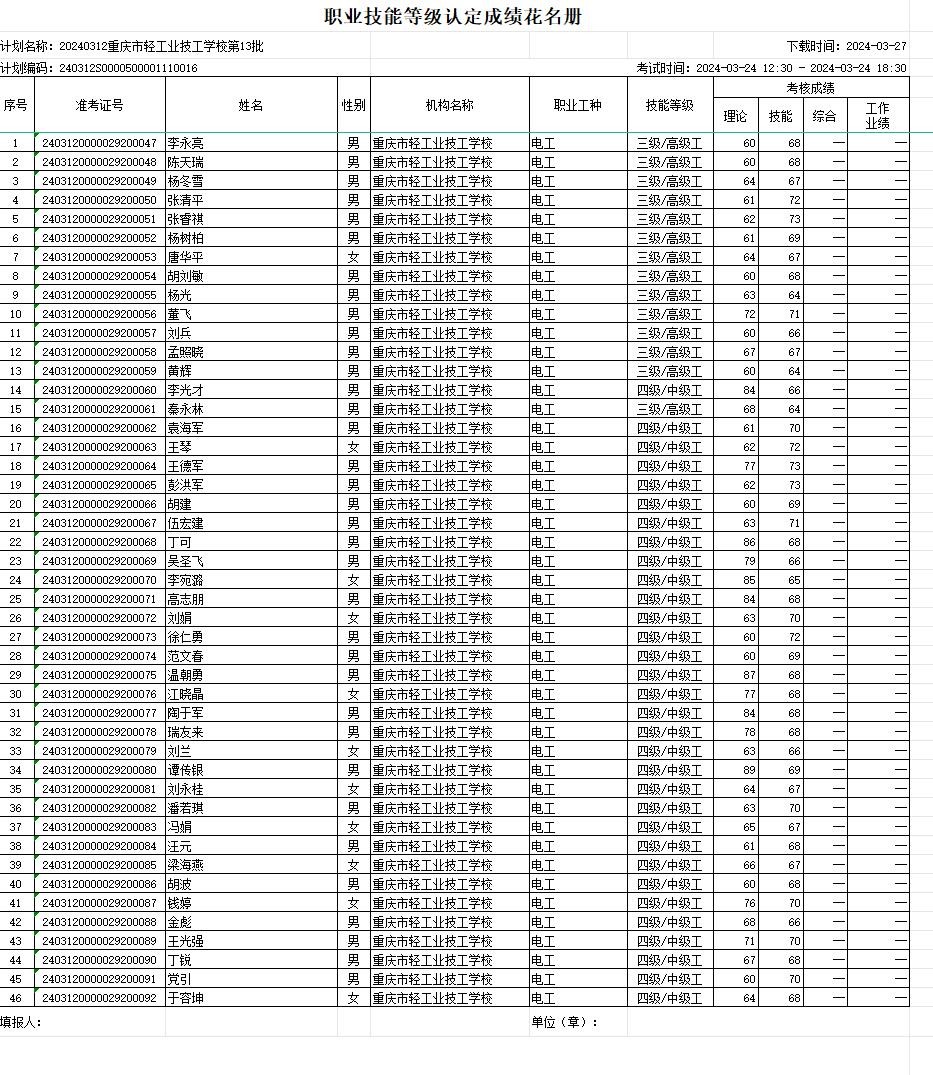 根据《重庆市职业技能等级认定考试考务工作规程( 试行 ) 的通知》(渝职鉴发[2021]23 号 ) 文件精神,重庆市轻工业技工学校现将 2024 年03月24日组织的共1个批次46人职业技能等级认定成绩进行公示 (见附件)。 公示期为发布之日起计算 5 天,如对个人成绩有疑问,请在公示期内提出成绩复核申请,公示期结束,不再接受复核申请
