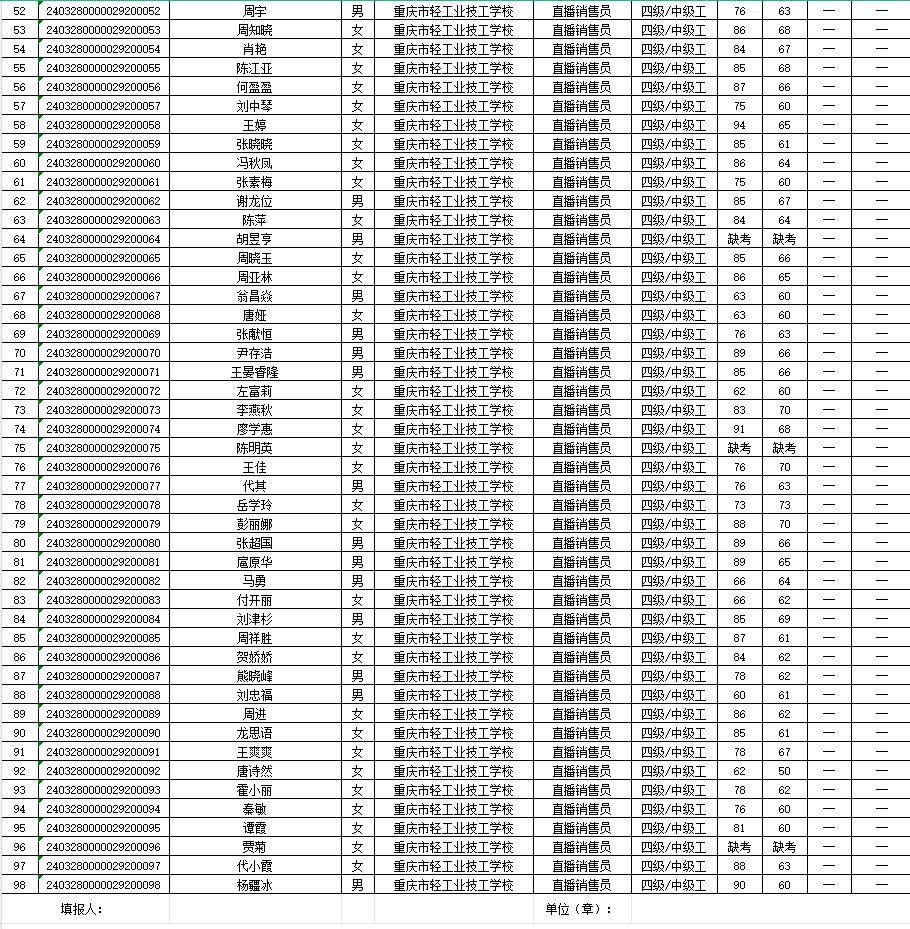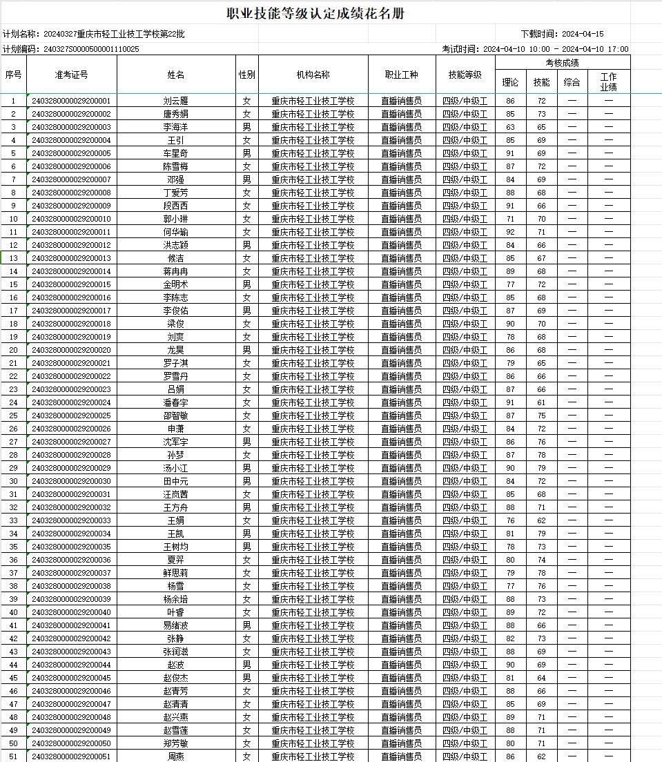 根据《重庆市职业技能等级认定考试考务工作规程( 试行 ) 的通知》(渝职鉴发[2021]23 号 ) 文件精神,重庆市轻工业技工学校现将 2024 年04月10日组织的共1个批次98人职业技能等级认定成绩进行公示 (见附件)。 公示期为发布之日起计算 5 天,如对个人成绩有疑问,请在公示期内提出成绩复核申请,公示期结束,不再接受复核申请