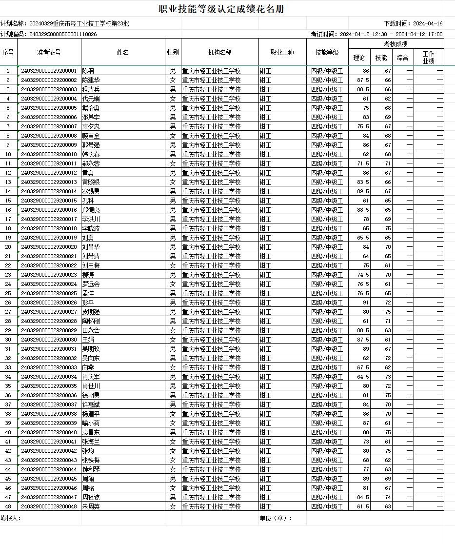 根据《重庆市职业技能等级认定考试考务工作规程( 试行 ) 的通知》(渝职鉴发[2021]23 号 ) 文件精神,重庆市轻工业技工学校现将 2024 年04月12日组织的共1个批次48人职业技能等级认定成绩进行公示 (见附件)。 公示期为发布之日起计算 5 天,如对个人成绩有疑问,请在公示期内提出成绩复核申请,公示期结束,不再接受复核申请