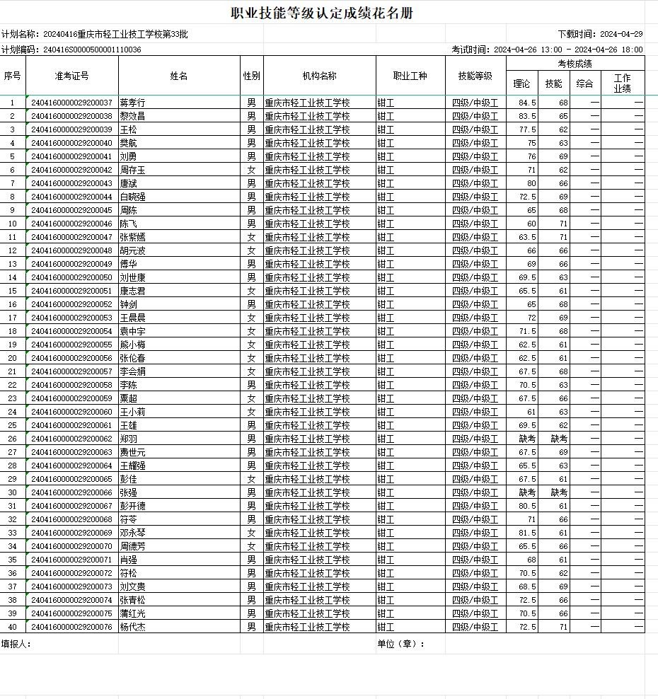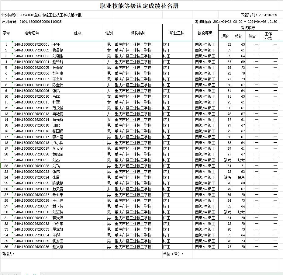 职业技能等级认定成绩花名册31批20240425