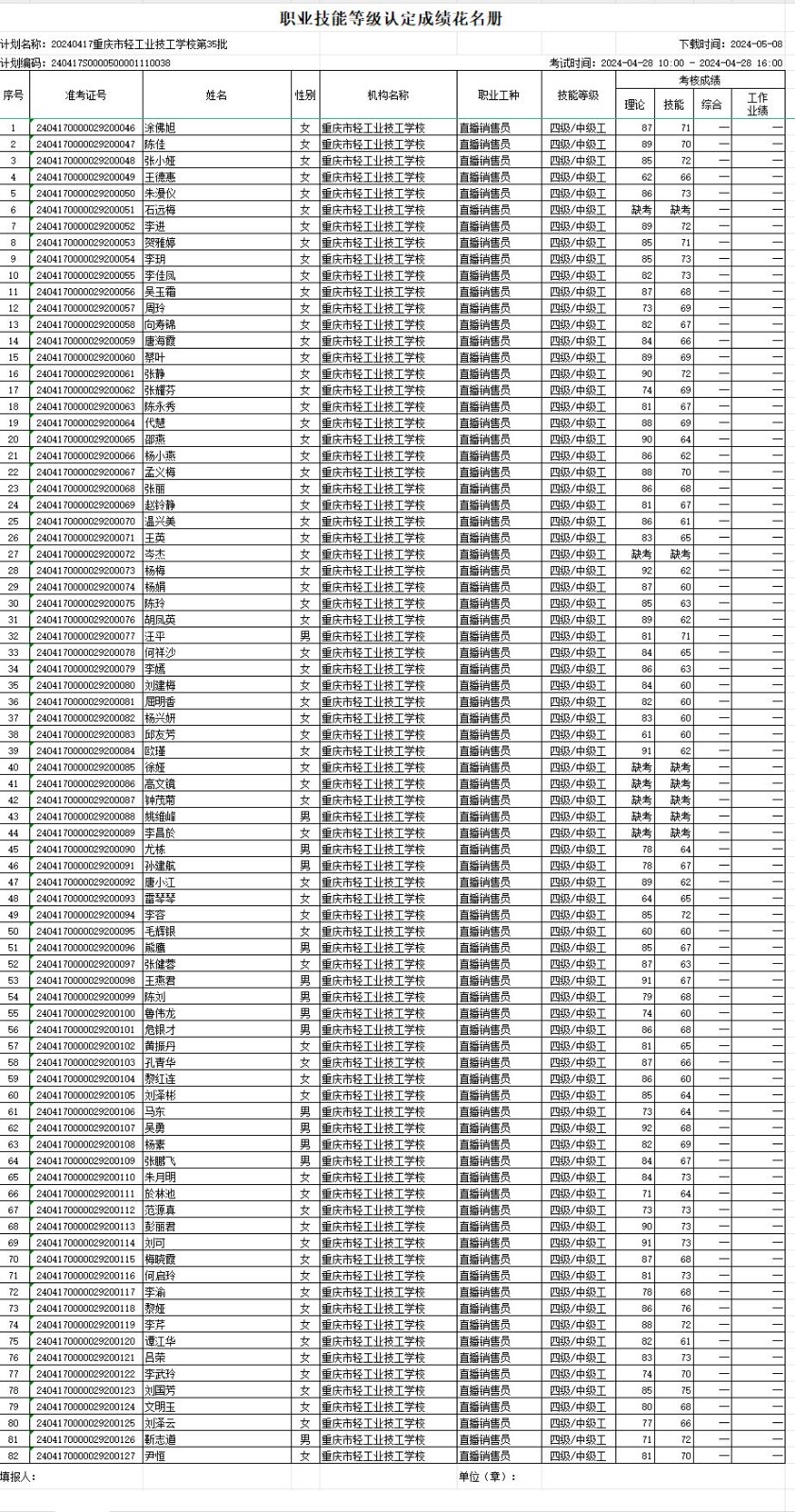 根据《重庆市职业技能等级认定考试考务工作规程( 试行 ) 的通知》(渝职鉴发[2021]23 号 ) 文件精神,重庆市轻工业技工学校现将 2024 年04月28日组织的共1个批次82人职业技能等级认定成绩进行公示 (见附件)。 公示期为发布之日起计算 5 天,如对个人成绩有疑问,请在公示期内提出成绩复核