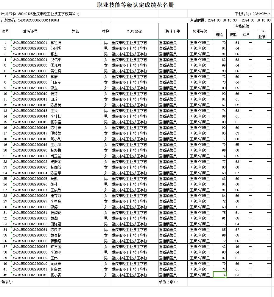 根据《重庆市职业技能等级认定考试考务工作规程( 试行 ) 的通知》(渝职鉴发[2021]23 号 ) 文件精神,重庆市轻工业技工学校现将 2024 年05月10日组织的共1个批次42人职业技能等级认定成绩进行公示 (见附件)。 公示期为发布之日起计算 5 天,如对个人成绩有疑问,请在公示期内提出成绩复核