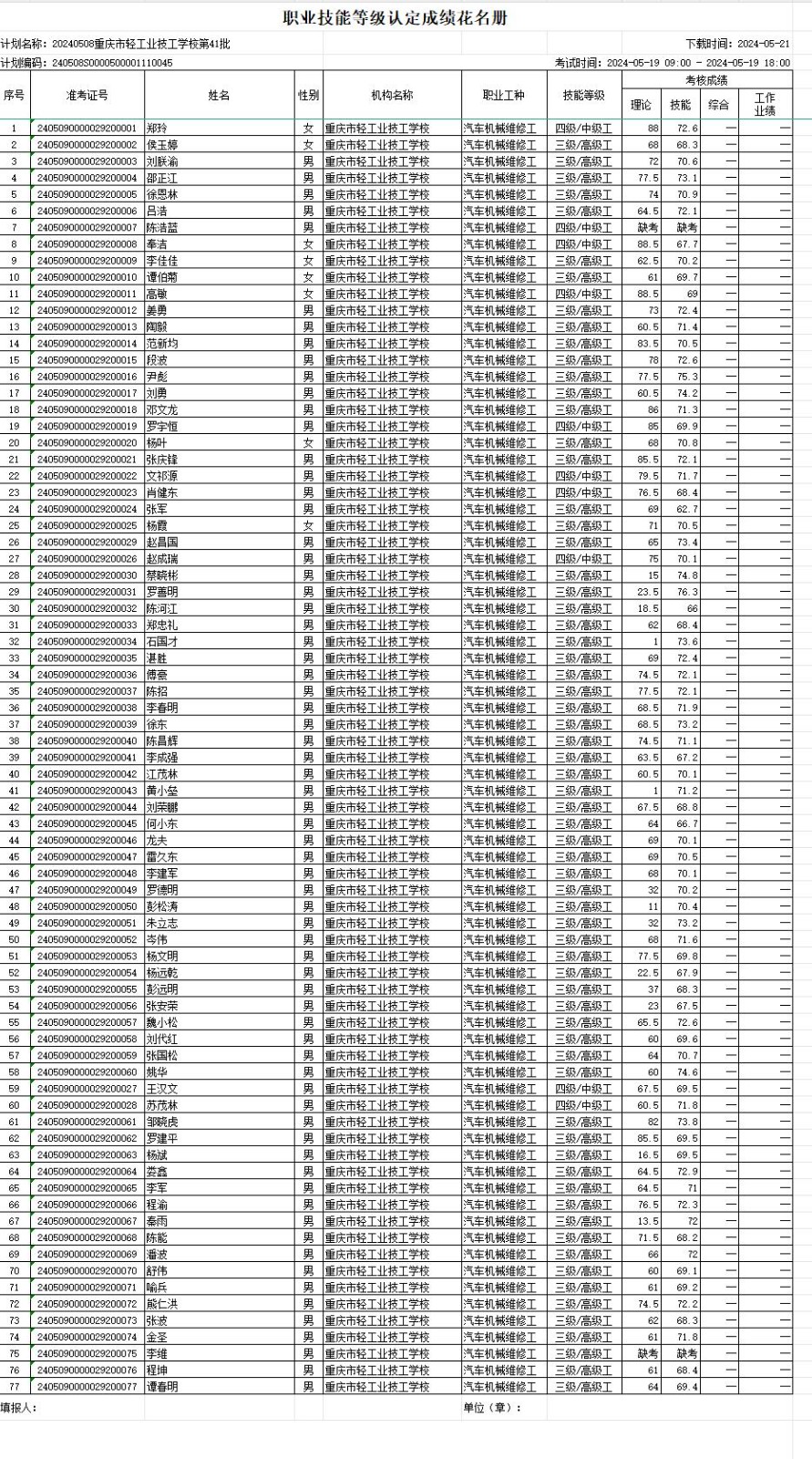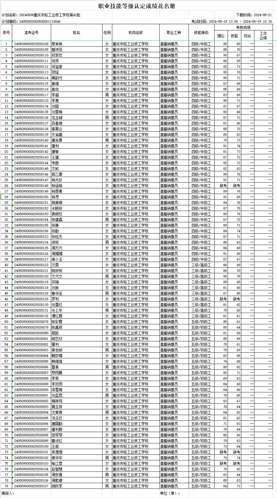 根据《重庆市职业技能等级认定考试考务工作规程( 试行 ) 的通知》(渝职鉴发[2021]23 号 ) 文件精神,重庆市轻工业技工学校现将 2024 年05月19日组织的共2个批次156人职业技能等级认定成绩进行公示 (见附件)。 公示期为发布之日起计算 5 天,如对个人成绩有疑问,请在公示期内提出成绩复核