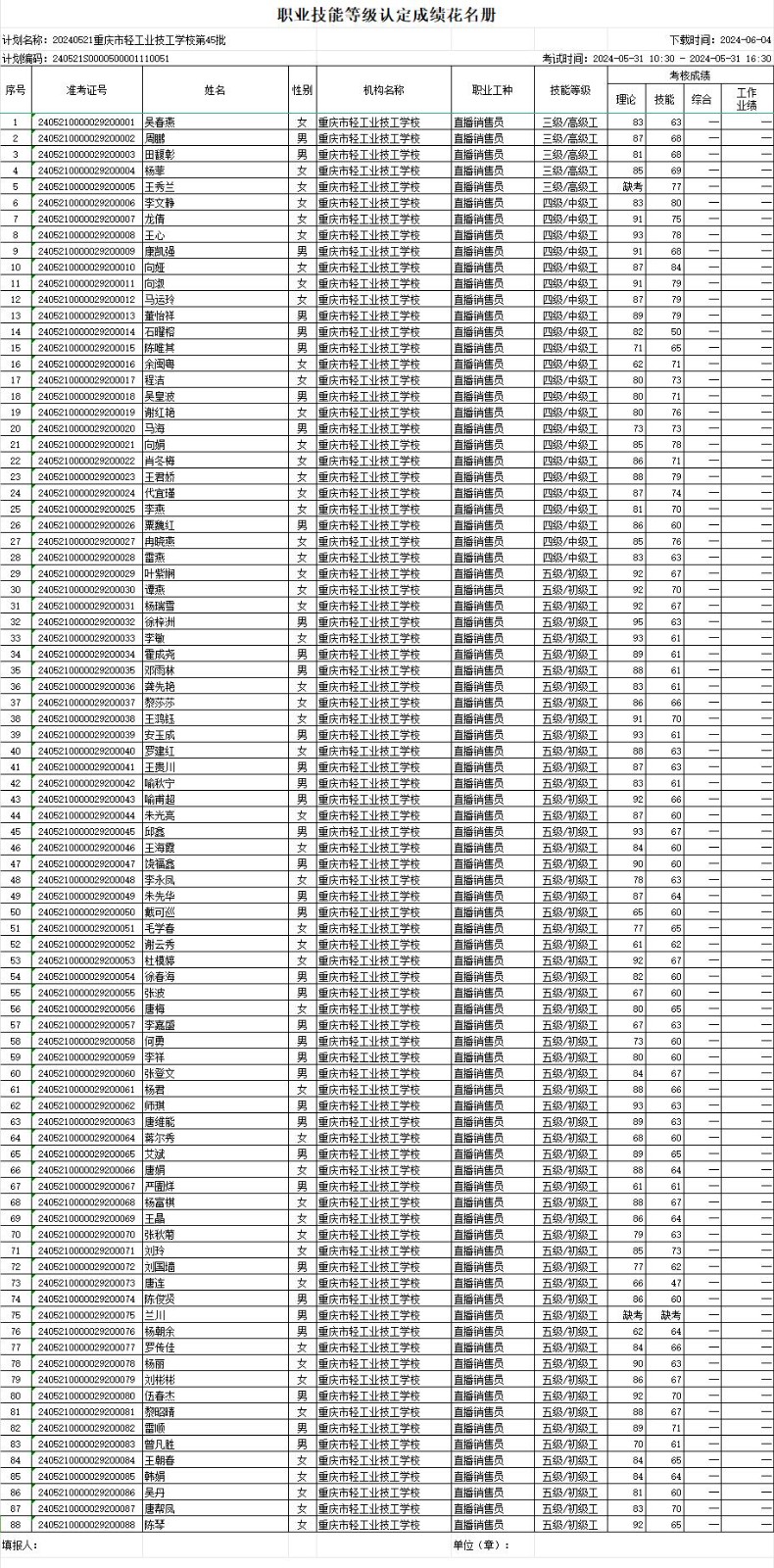 根据《重庆市职业技能等级认定考试考务工作规程( 试行 ) 的通知》(渝职鉴发[2021]23 号 ) 文件精神,重庆市轻工业技工学校现将 2024年05月31日组织的共1个批次88人职业技能等级认定成绩进行公示 (见附件)。 公示期为发布之日起计算 5 天,如对个人成绩有疑问,请在公示期内提出成绩复核