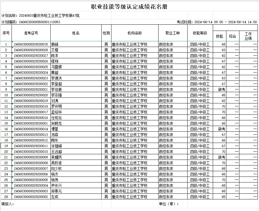 根据《重庆市职业技能等级认定考试考务工作规程( 试行 ) 的通知》(渝职鉴发[2021]23 号 ) 文件精神,重庆市轻工业技工学校现将 2024年06月14日组织的共1个批次28人职业技能等级认定成绩进行公示 (见附件)。 公示期为发布之日起计算 5 天,如对个人成绩有疑问,请在公示期内提出成绩复核