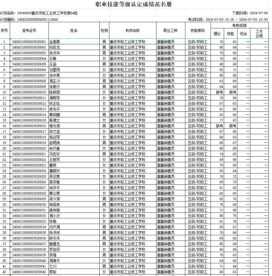 职业技能等级认定成绩花名册54批20240703