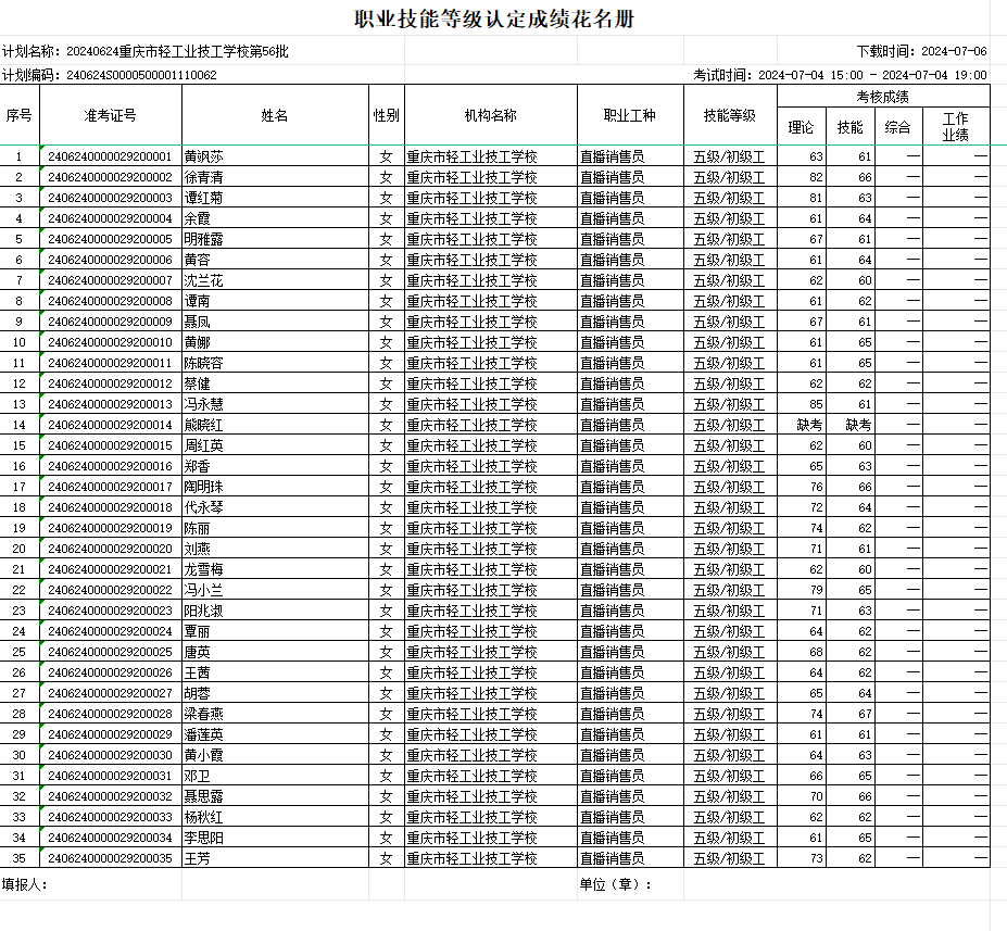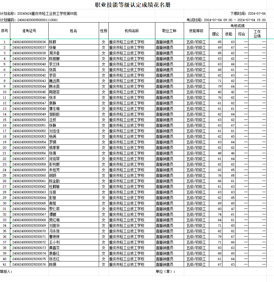 职业技能等级认定成绩花名册55/56批20240704