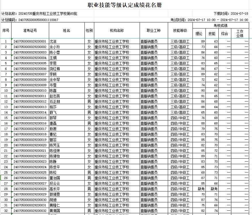 根据《重庆市职业技能等级认定考试考务工作规程( 试行 ) 的通知》(渝职鉴发[2021]23 号 ) 文件精神,重庆市轻工业技工学校现将 2024年07月17日组织的共1个批次68人职业技能等级认定成绩进行公示 (见附件)。 公示期为发布之日起计算 5 天,如对个人成绩有疑问,请在公示期内提出成绩复核