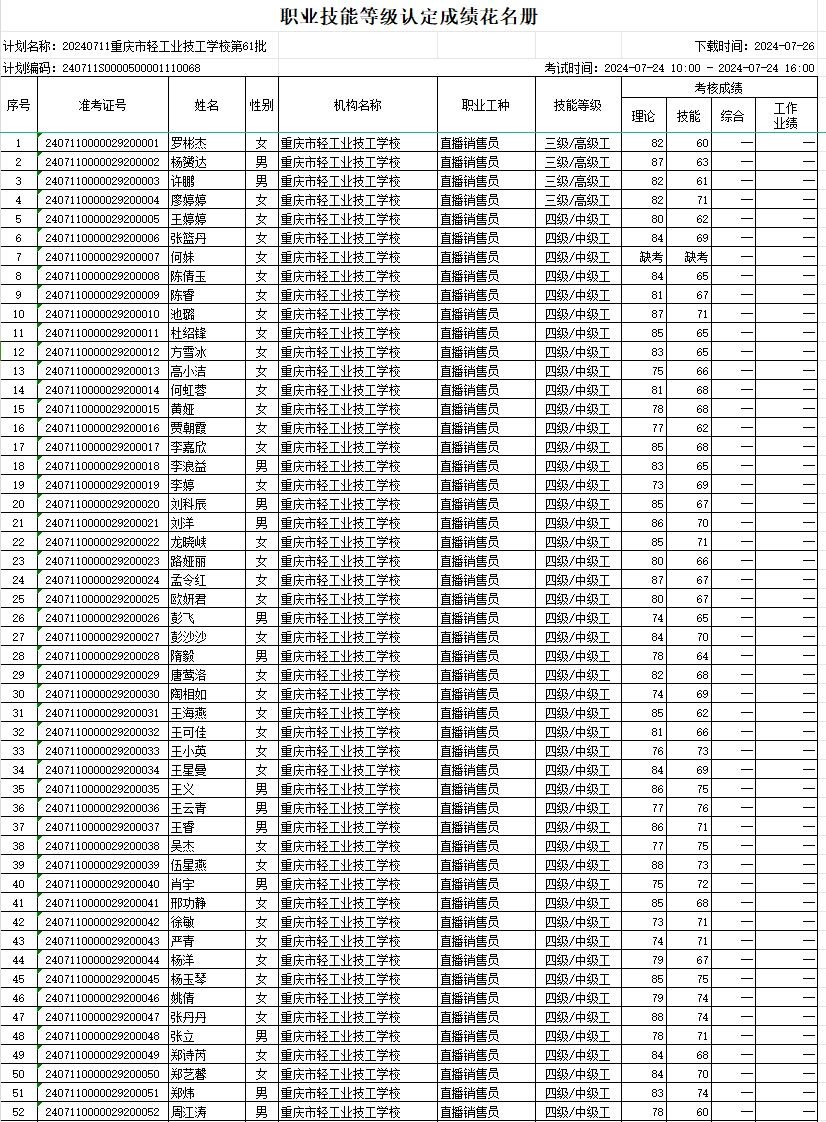 根据《重庆市职业技能等级认定考试考务工作规程( 试行 ) 的通知》(渝职鉴发[2021]23 号 ) 文件精神,重庆市轻工业技工学校现将 2024年07月24日组织的共1个批次108人职业技能等级认定成绩进行公示 (见附件)。 公示期为发布之日起计算 5 天,如对个人成绩有疑问,请在公示期内提出成绩复核