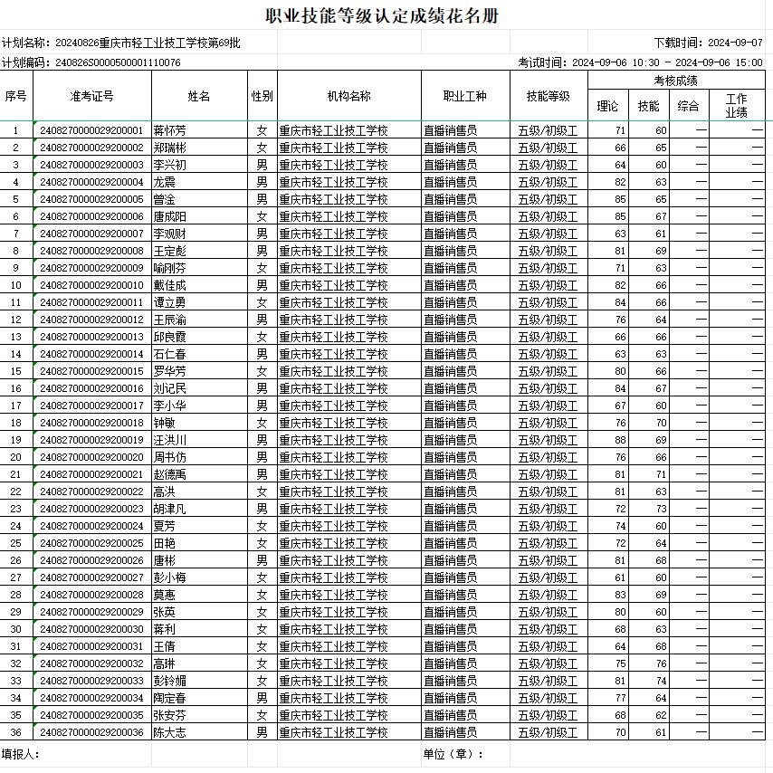 根据《重庆市职业技能等级认定考试考务工作规程( 试行 ) 的通知》(渝职鉴发[2021]23 号 ) 文件精神,重庆市轻工业技工学校现将 2024年09月06日组织的共1个批次36人职业技能等级认定成绩进行公示 (见附件)。 公示期为发布之日起计算 5 天,如对个人成绩有疑问,请在公示期内提出成绩复核申请,公示期结束,不再接受复核申请.