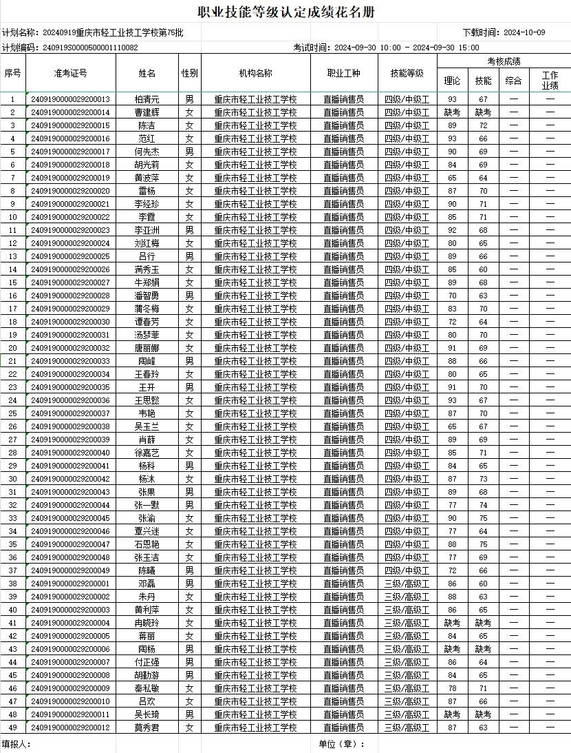 职业技能等级认定成绩花名册75批20240930
