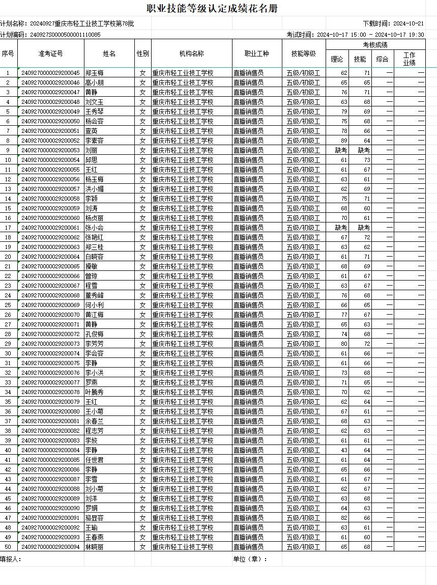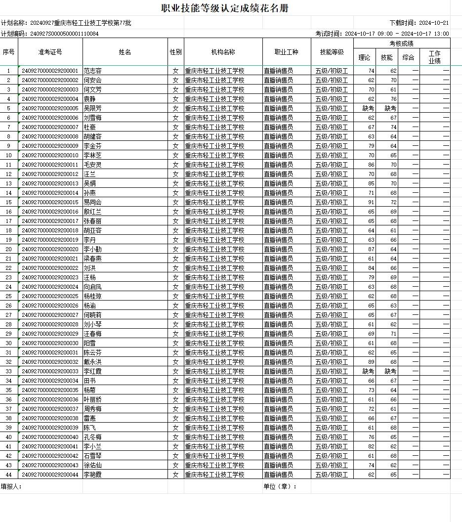 职业技能等级认定成绩花名册77/78批20241017