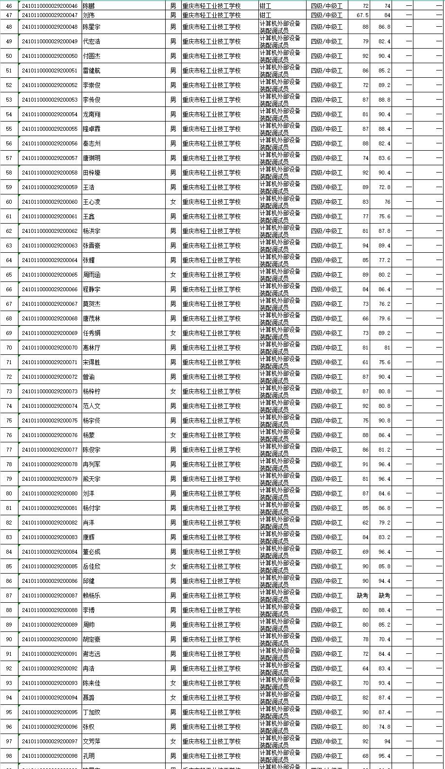 根据《重庆市职业技能等级认定考试考务工作规程( 试行 ) 的通知》(渝职鉴发[2021]23 号 ) 文件精神,重庆市轻工业技工学校现将 2024年10月22日组织的共1个批次共140人职业技能等级认定成绩进行公示 (见附件)。 公示期为发布之日起计算 5 天,如对个人成绩有疑问,请在公示期内提出成绩复核申请,公示期结束,不再接受复核申请.