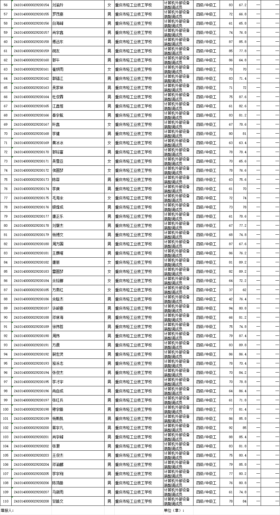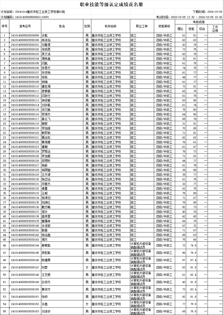 根据《重庆市职业技能等级认定考试考务工作规程( 试行 ) 的通知》(渝职鉴发[2021]23 号 ) 文件精神,重庆市轻工业技工学校现将 2024年10月25日组织的共1个批次共110人职业技能等级认定成绩进行公示 (见附件)。 公示期为发布之日起计算 5 天,如对个人成绩有疑问,请在公示期内提出成绩复核申请,公示期结束,不再接受复核申请.
