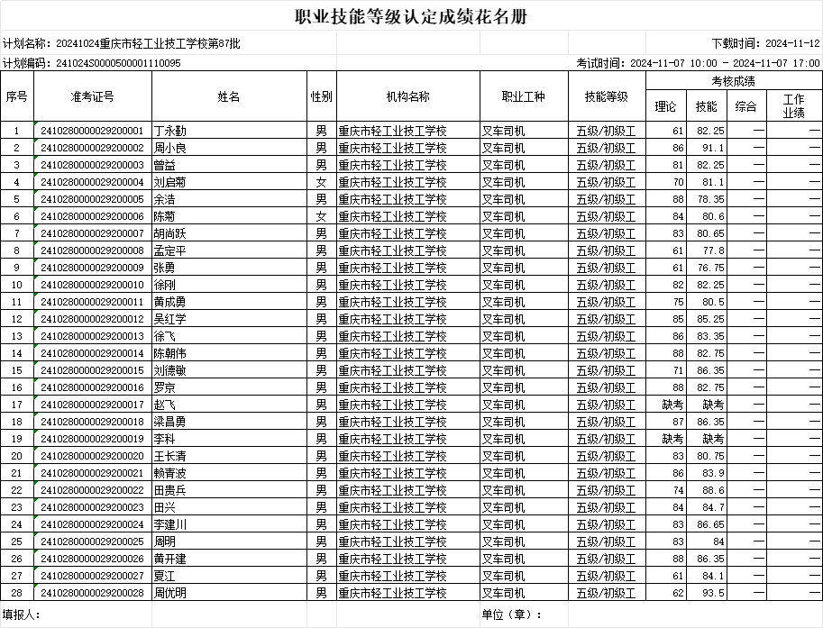 职业技能等级认定成绩花名册87批20241107
