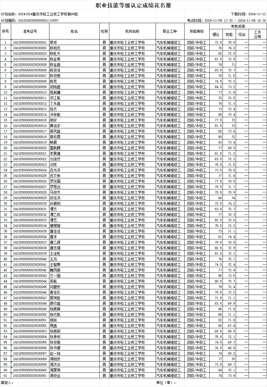 职业技能等级认定成绩花名册89批20241108