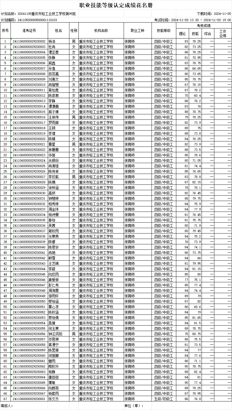 根据《重庆市职业技能等级认定考试考务工作规程( 试行 ) 的通知》(渝职鉴发[2021]23 号 ) 文件精神,重庆市轻工业技工学校现将 2024年11月20日组织的共1个批次共67人职业技能等级认定成绩进行公示 (见附件)。 公示期为发布之日起计算 5 天,如对个人成绩有疑问,请在公示期内提出成绩复核申请,公示期结束,不再接受复核申请.