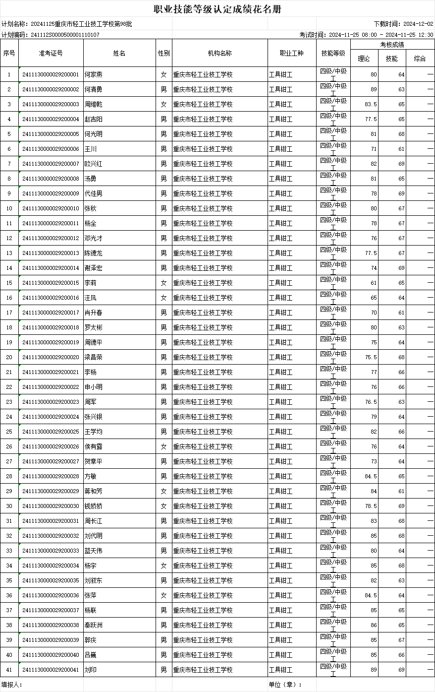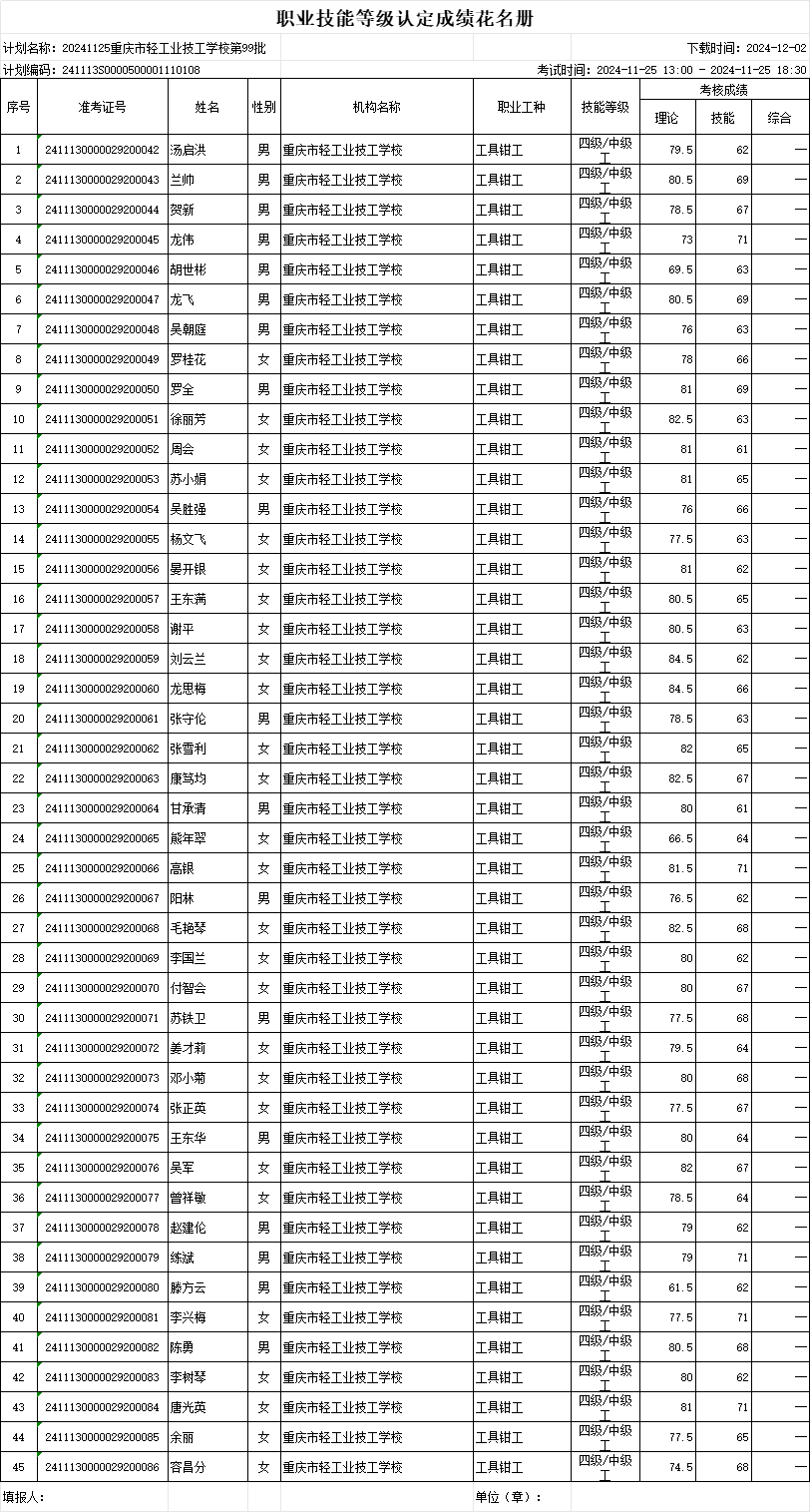 根据《重庆市职业技能等级认定考试考务工作规程( 试行 ) 的通知》(渝职鉴发[2021]23 号 ) 文件精神,重庆市轻工业技工学校现将 2024年11月25日组织的共2个批次共86人职业技能等级认定成绩进行公示 (见附件)。 公示期为发布之日起计算 5 天,如对个人成绩有疑问,请在公示期内提出成绩复核申请,公示期结束,不再接受复核申请.