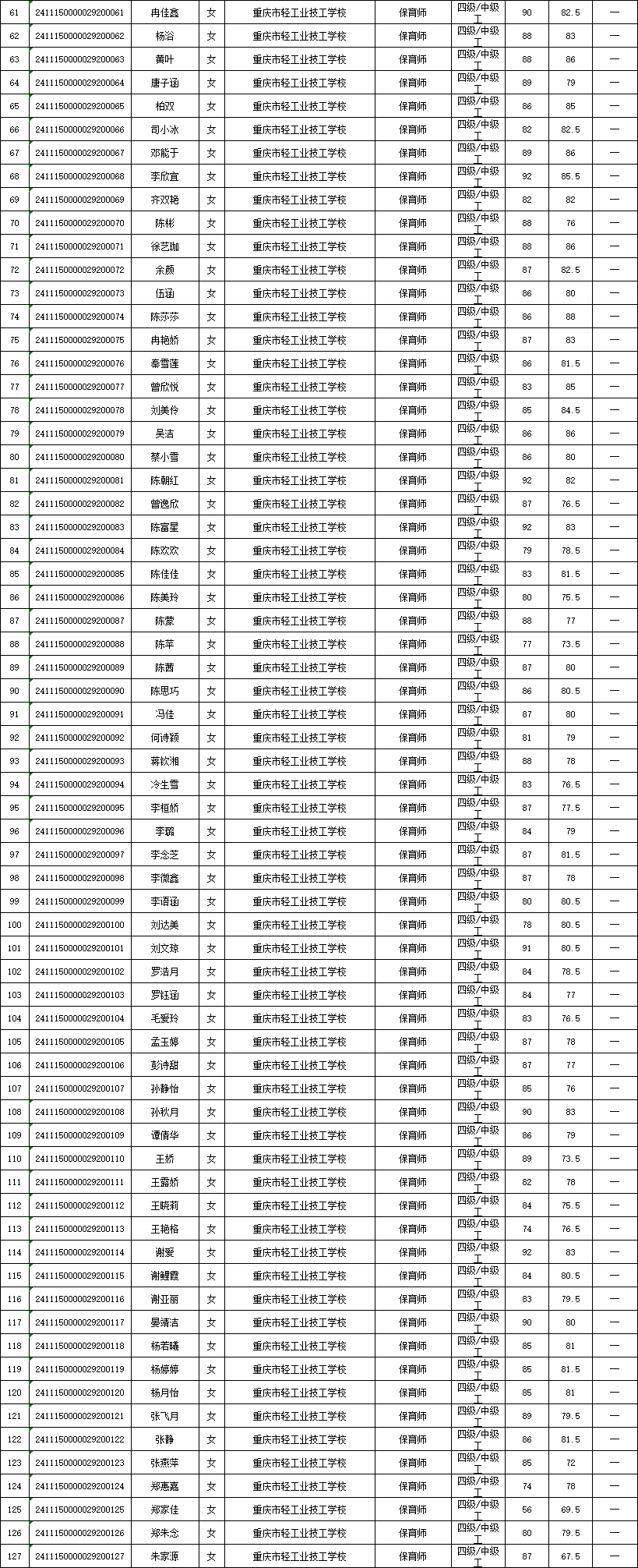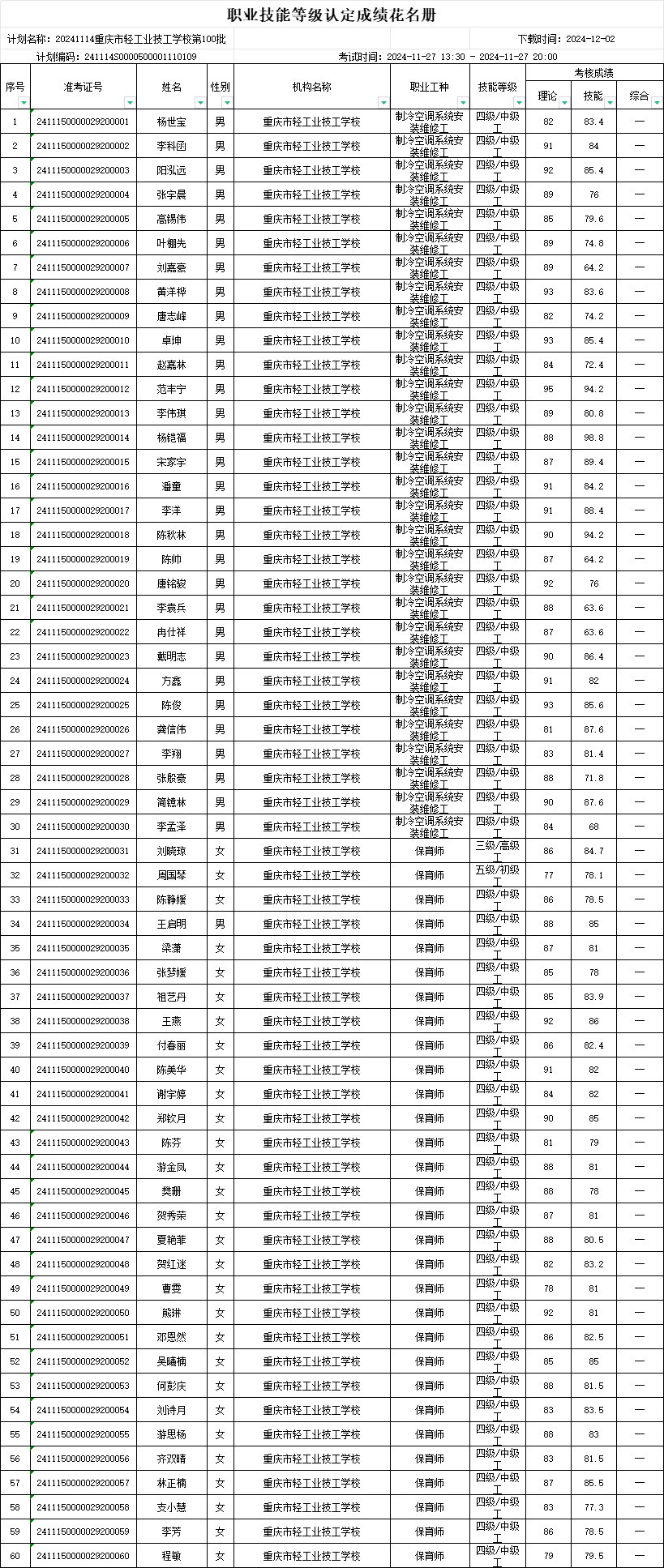 根据《重庆市职业技能等级认定考试考务工作规程( 试行 ) 的通知》(渝职鉴发[2021]23 号 ) 文件精神,重庆市轻工业技工学校现将 2024年11月27日组织的共1个批次共127人职业技能等级认定成绩进行公示 (见附件)。 公示期为发布之日起计算 5 天,如对个人成绩有疑问,请在公示期内提出成绩复核申请,公示期结束,不再接受复核申请.