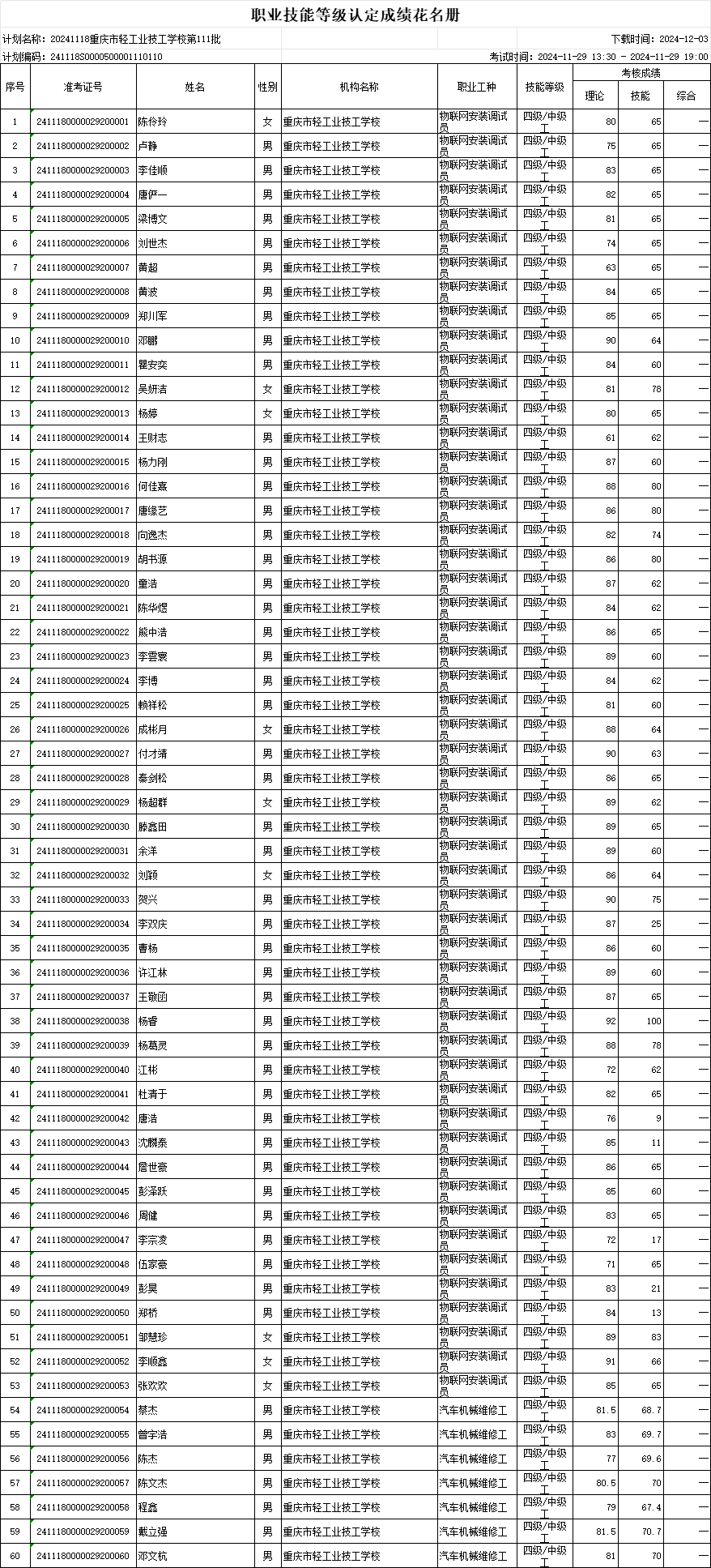 职业技能等级认定成绩花名册111批20241129