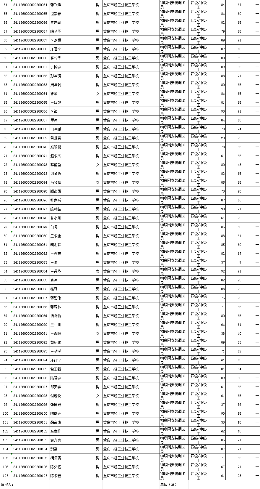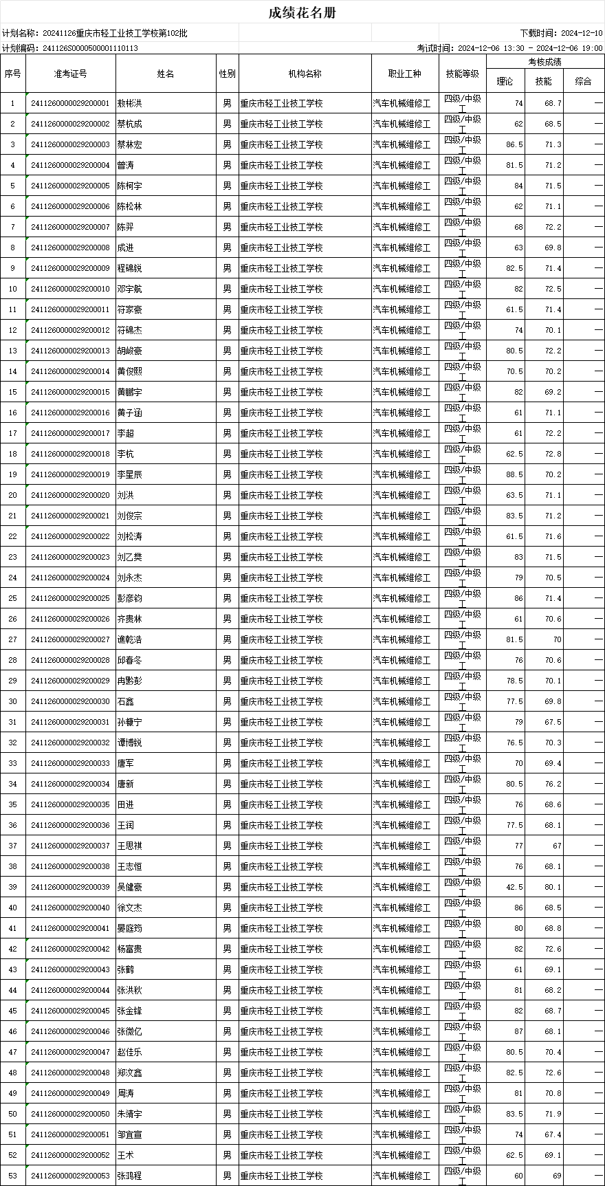 职业技能等级认定成绩花名册102批20241206
