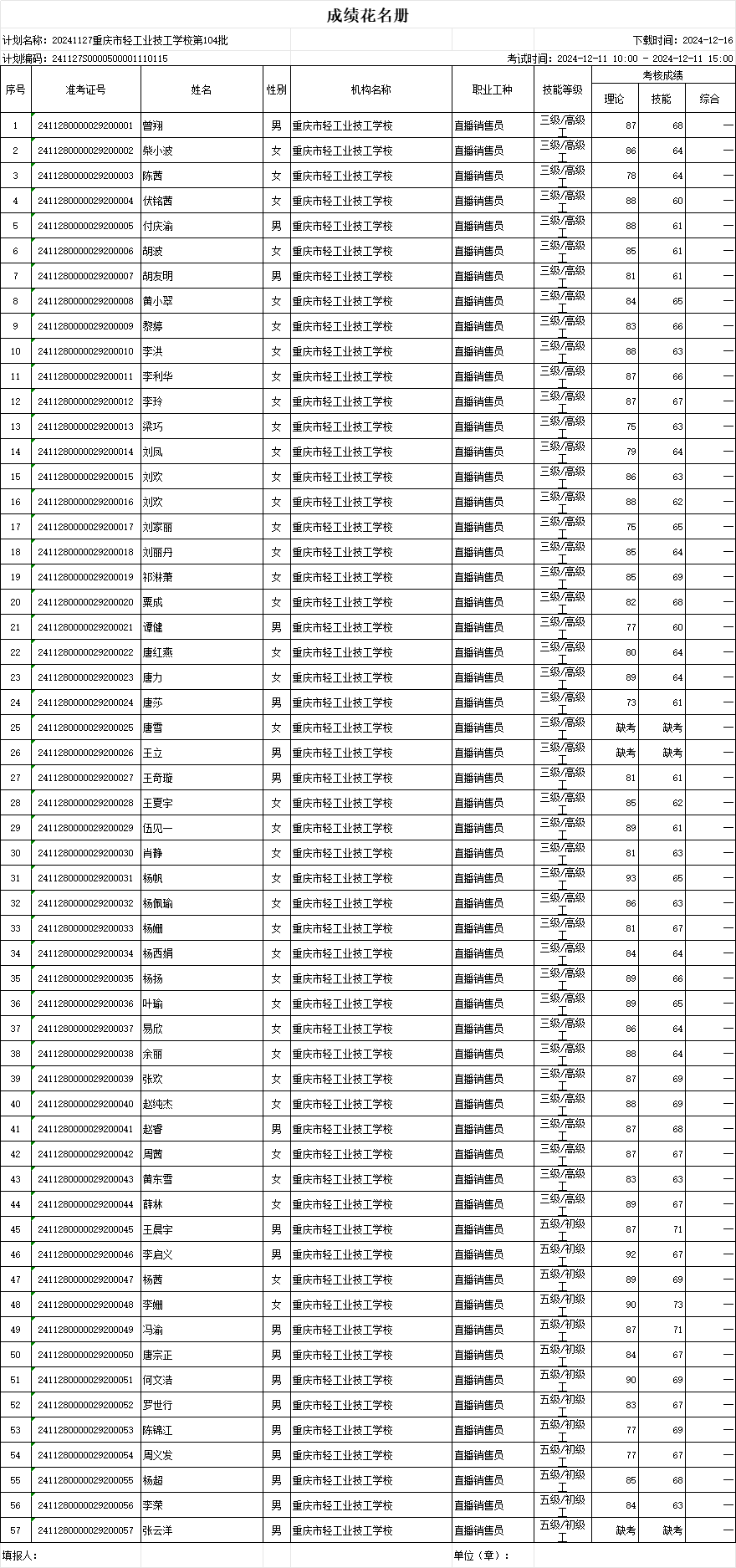 职业技能等级认定成绩花名册104批20241211