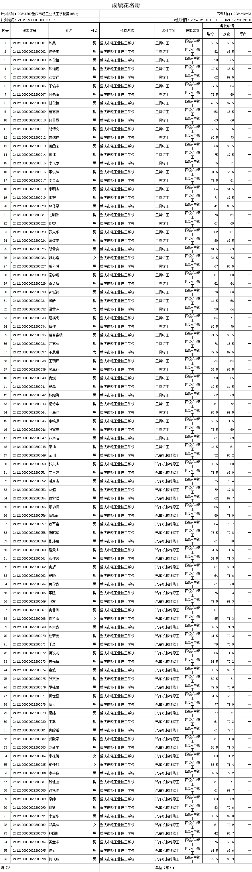 根据《重庆市职业技能等级认定考试考务工作规程( 试行 ) 的通知》(渝职鉴发[2021]23 号 ) 文件精神,重庆市轻工业技工学校现将 2024年12月20日组织的共1个批次共96人职业技能等级认定成绩进行公示 (见附