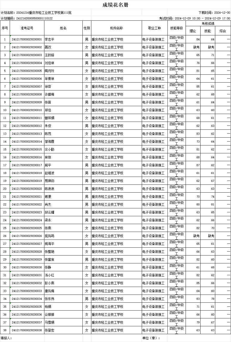 据《重庆市职业技能等级认定考试考务工作规程( 试行 ) 的通知》(渝职鉴发[2021]23 号 ) 文件精神,重庆市轻工业技工学校现将 2024年12月29日组织的共1个批次共38人职业技能等级认定成绩进行公示 (见附件)。 公示期为发布之日起计算 5 个工作日,如对个人成绩有疑问,请在公示期内提出成绩复核申请,公示期结束,不再接受复核申请。