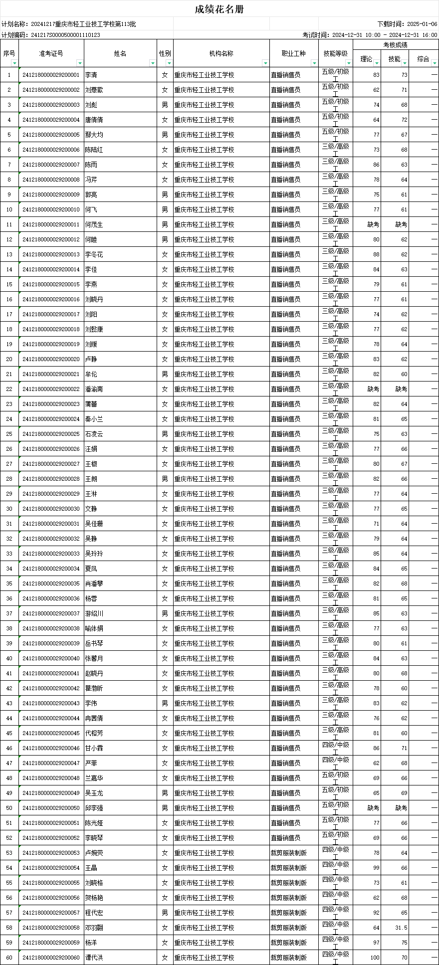 职业技能等级认定成绩花名册113批20241231