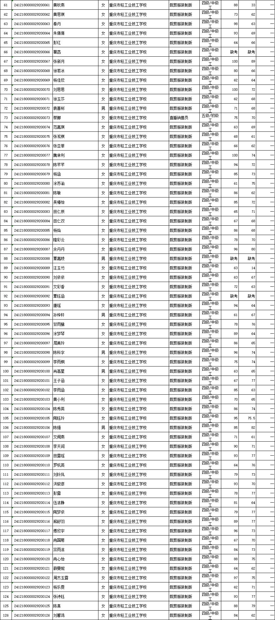 据《重庆市职业技能等级认定考试考务工作规程( 试行 ) 的通知》(渝职鉴发[2021]23 号 ) 文件精神,重庆市轻工业技工学校现将 2024年12月31日组织的共1个批次共126人职业技能等级认定成绩进行公示 (见附件)。 公示期为发布之日起计算 5 个工作日,如对个人成绩有疑问,请在公示期内提出成绩复核申请,公示期结束,不再接受复核申请。