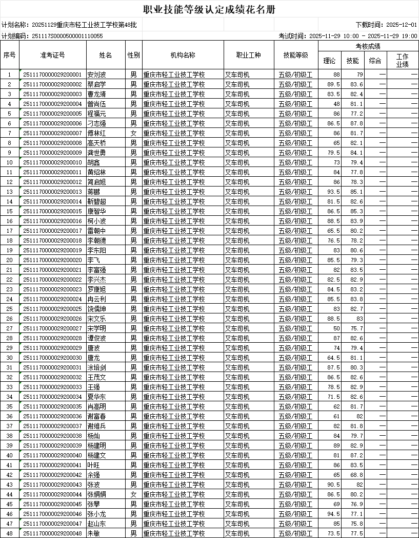 根据《重庆市职业技能等级认定考试考务工作规程(试行)的通知》(渝职鉴发[2021123号)文件精神,重庆市轻工业技工学校现将2025年11月29日组织的1个批次共48人职业技能等级认定成绩进行公示(见附件)。公示期为发布之日起计算5 个工作日(即2025年12月01日-2025年12月05日),如对个人成绩有疑问,请在公示期内提出成绩复核申请,公示期结束,不再接受复核申请。 联系方式:雷老师17783053868、艾老师15213320351; 投诉电话023-86089665,邮箱411627445@qq.com