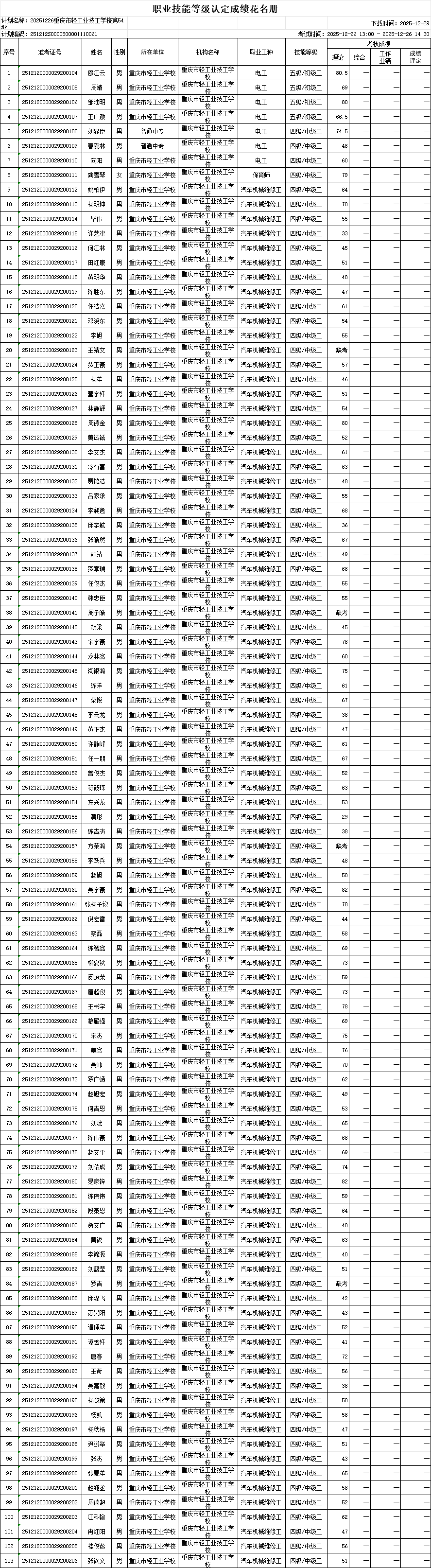 根据《重庆市职业技能等级认定考试考务工作规程(试行)的通知》(渝职鉴发[2021123号)文件精神,重庆市轻工业技工学校现将2025年12月26日组织的1个批次共103人职业技能等级认定成绩进行公示(见附件)。公示期为发布之日起计算5 个工作日(即2025年12月29日-2026年01月05日),如对个人成绩有疑问,请在公示期内提出成绩复核申请,公示期结束,不再接受复核申请。 联系方式:雷老师17783053868、艾老师15213320351; 投诉电话023-86089665,邮箱411627445@qq.com