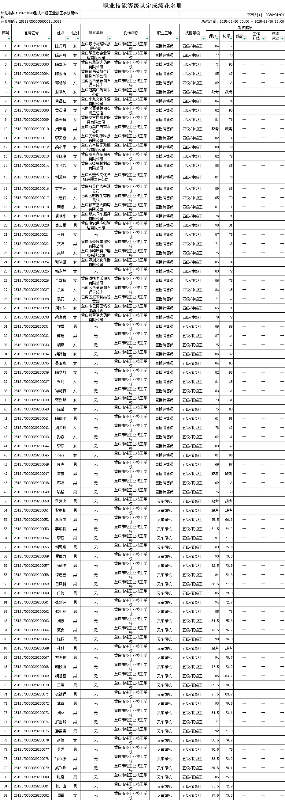 根据《重庆市职业技能等级认定考试考务工作规程(试行)的通知》(渝职鉴发[2021123号)文件精神,重庆市轻工业技工学校现将2025年12月30日组织的1个批次共82人职业技能等级认定成绩进行公示(见附件)。公示期为发布之日起计算5 个工作日(即2026年01月04日-2026年01月08日),如对个人成绩有疑问,请在公示期内提出成绩复核申请,公示期结束,不再接受复核申请。 联系方式:雷老师17783053868、艾老师15213320351; 投诉电话023-86089665,邮箱411627445@qq.com