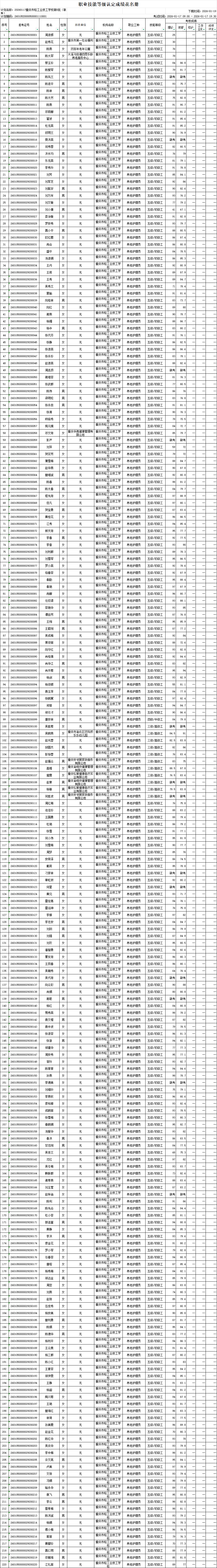 根据《重庆市职业技能等级认定考试考务工作规程(试行)的通知》(渝职鉴发[2021123号)文件精神,重庆市轻工业技工学校现将2026年1月17日组织的1个批次共220人职业技能等级认定成绩进行公示(见附件)。公示期为发布之日起计算5 个工作日(即2026年01月19日-2026年01月23日),如对个人成绩有疑问,请在公示期内提出成绩复核申请,公示期结束,不再接受复核申请。 联系方式:雷老师17783053868、艾老师15213320351; 投诉电话023-86089665,邮箱411627445@qq.com