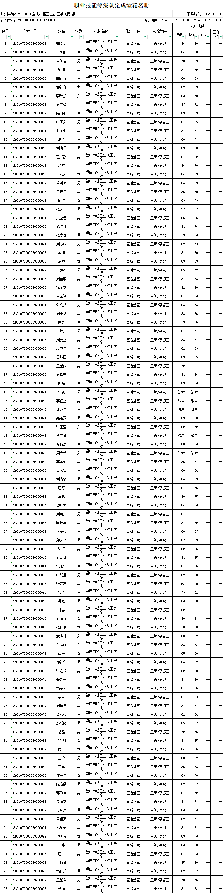 根据《重庆市职业技能等级认定考试考务工作规程(试行)的通知》(渝职鉴发[2021123号)文件精神,重庆市轻工业技工学校现将2026年1月20日组织的1个批次共98人职业技能等级认定成绩进行公示(见附件)。公示期为发布之日起计算5 个工作日(即2026年01月26日-2026年01月30日),如对个人成绩有疑问,请在公示期内提出成绩复核申请,公示期结束,不再接受复核申请。 联系方式:雷老师17783053868、艾老师15213320351; 投诉电话023-86089665,邮箱411627445@qq.com